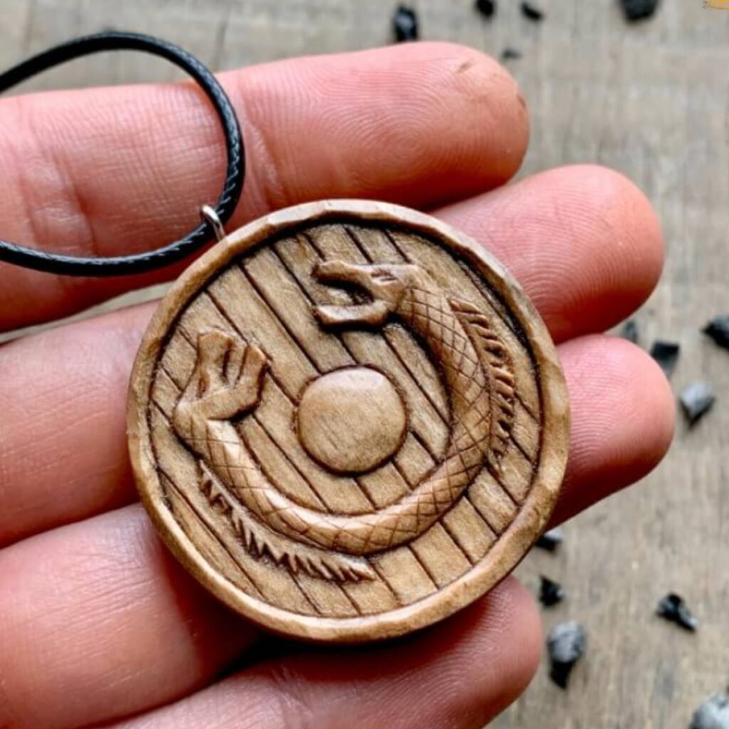 Dieser Ouroboros-Anhänger spielt auf Jörmungandr an , der seinen Schwanz in den Gewässern um Midgard hielt. Er ist außerdem mit magischen nordischen Runen im Inneren verziert.