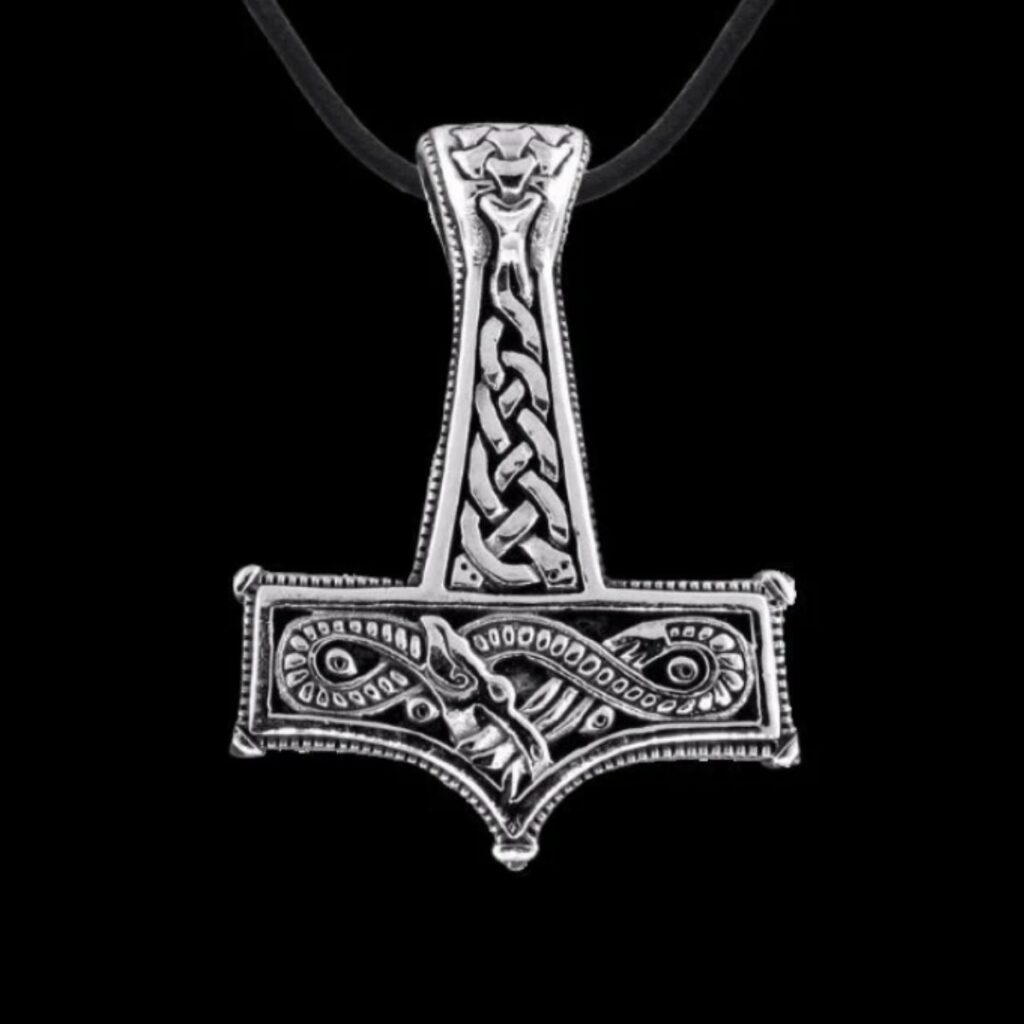 Ce pendentif en argent représentant le marteau de Thor, Mjöllnir, est orné d’un dragon de style nordique. Il évoque le combat épique entre Thor et Jörmungandr , symbolisant à la fois la protection divine et l’inéluctabilité du destin, qu’il faut affronter avec courage.