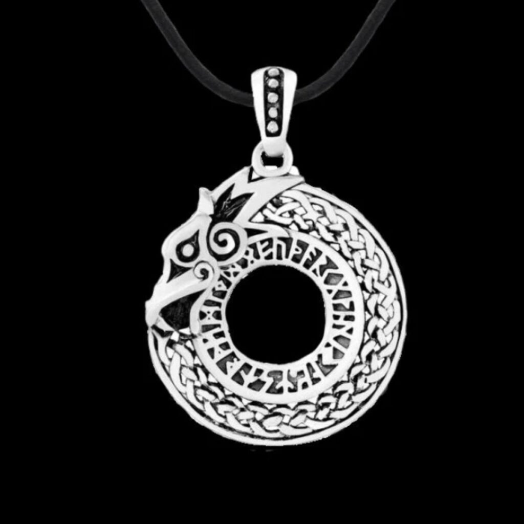 Ce pendentif Ouroboros évoque Jörmungandr se tenant la queue dans les eaux entourant Midgard. Il arbore également les runes nordiques magiques à l’intérieur de son motif.