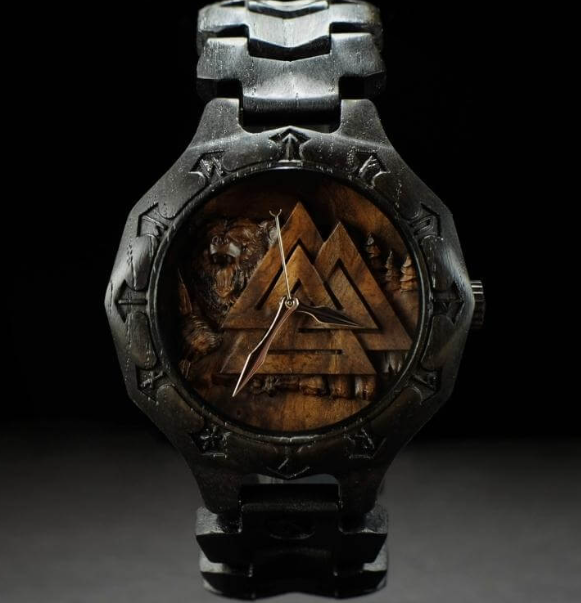 Cette superbe montre en bois arbore le Valknut et un symbole de l’ours. Les guerriers berserkers communiaient avec l’esprit de l’ours pour puiser dans leur férocité avant de partir au combat. Dans cet état d’extase, ils se croyaient invincibles.
