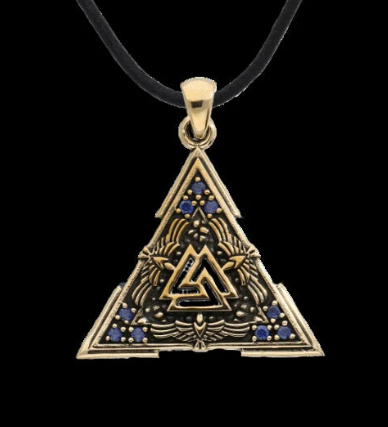 Ce magnifique pendentif Valknut en bronze associe le symbole aux corbeaux d’Odin, qui l’entourent sur trois côtés.