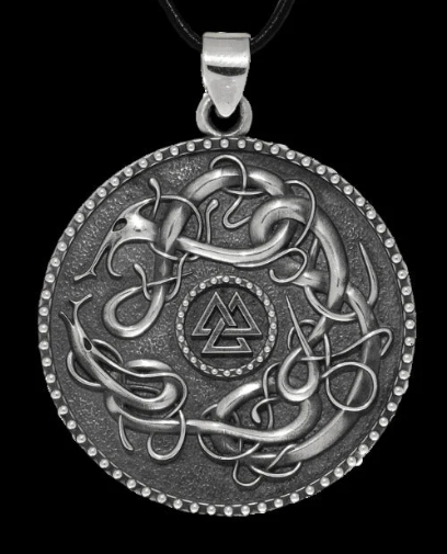 Ce magnifique pendentif en argent place le Valknut au centre , entouré de loups et de serpents ornés de rubans, dans le style traditionnel nordique d’Urnes .