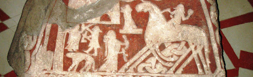 Détail d’une pierre runique de Tjängvide , à Gotland, représentant une femme tenant une corne à boire, probablement une Valkyrie.