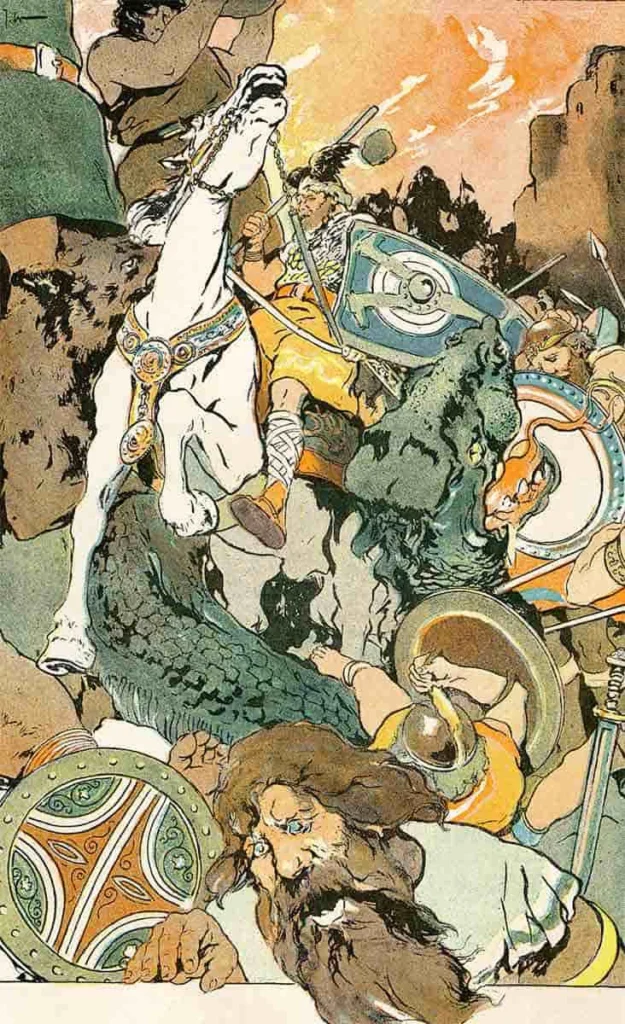 La bataille de Ragnarök, illustration de George Hand Wright, extraite de « Norse Stories, Retold from the Eddas », par Hamilton Wright Mabie, 1902